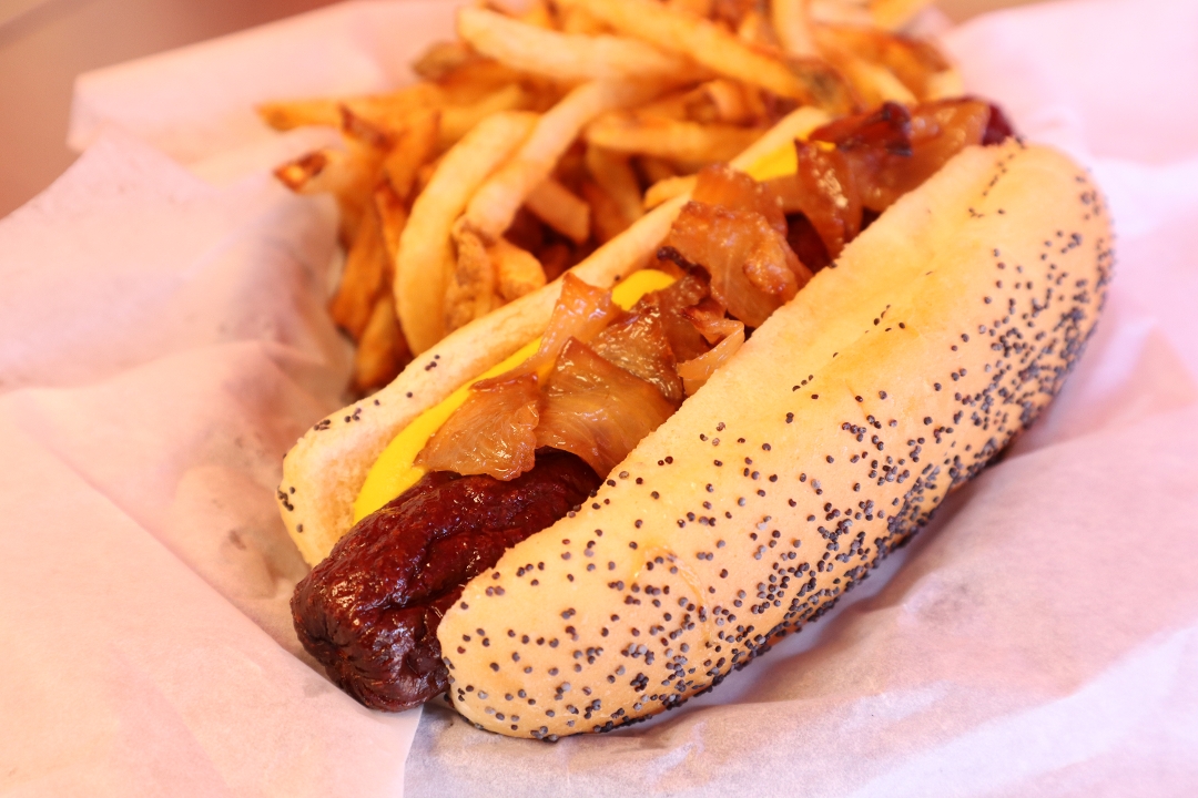 Vienna hot dog on a poppy seed bun. Comes with fries. "Chicago Style" is mustard, onion, relish, tomato, pickle, sport peppers, celery salt.