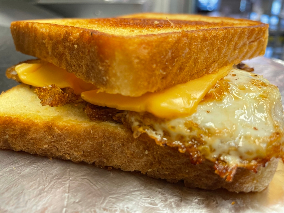 Toasted egg sandwich – 2 eggs over easy with American cheese on Texas toast! Choice to add bacon or gyro meat!